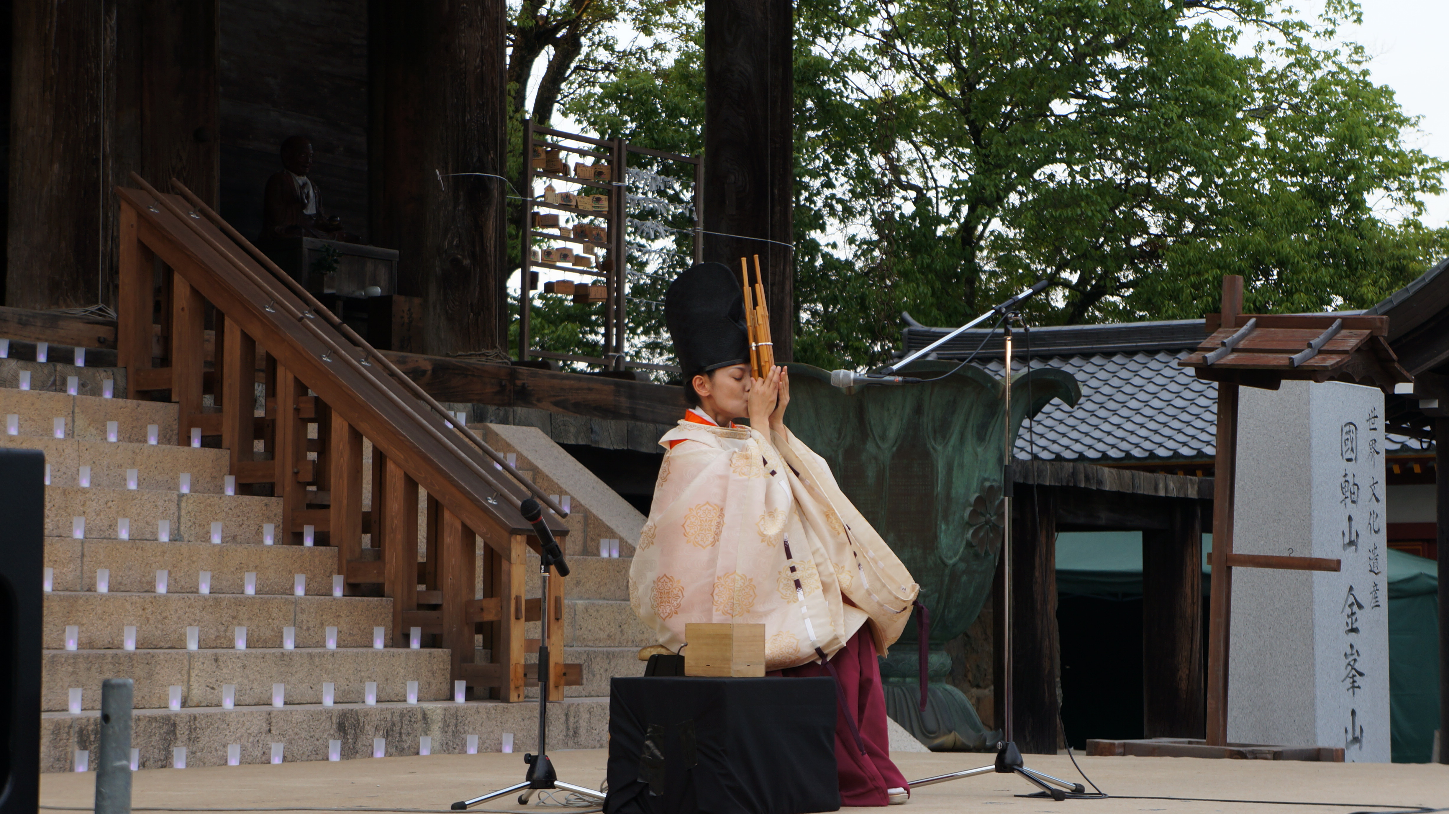修験者による儀式が厳粛に執り行われた後、雅楽で使われる代表的な楽器、笙の奏者、井原季子さんが登場し、奏でた優雅で幻想的な響きが、神聖な空間に溶け込んでいました。