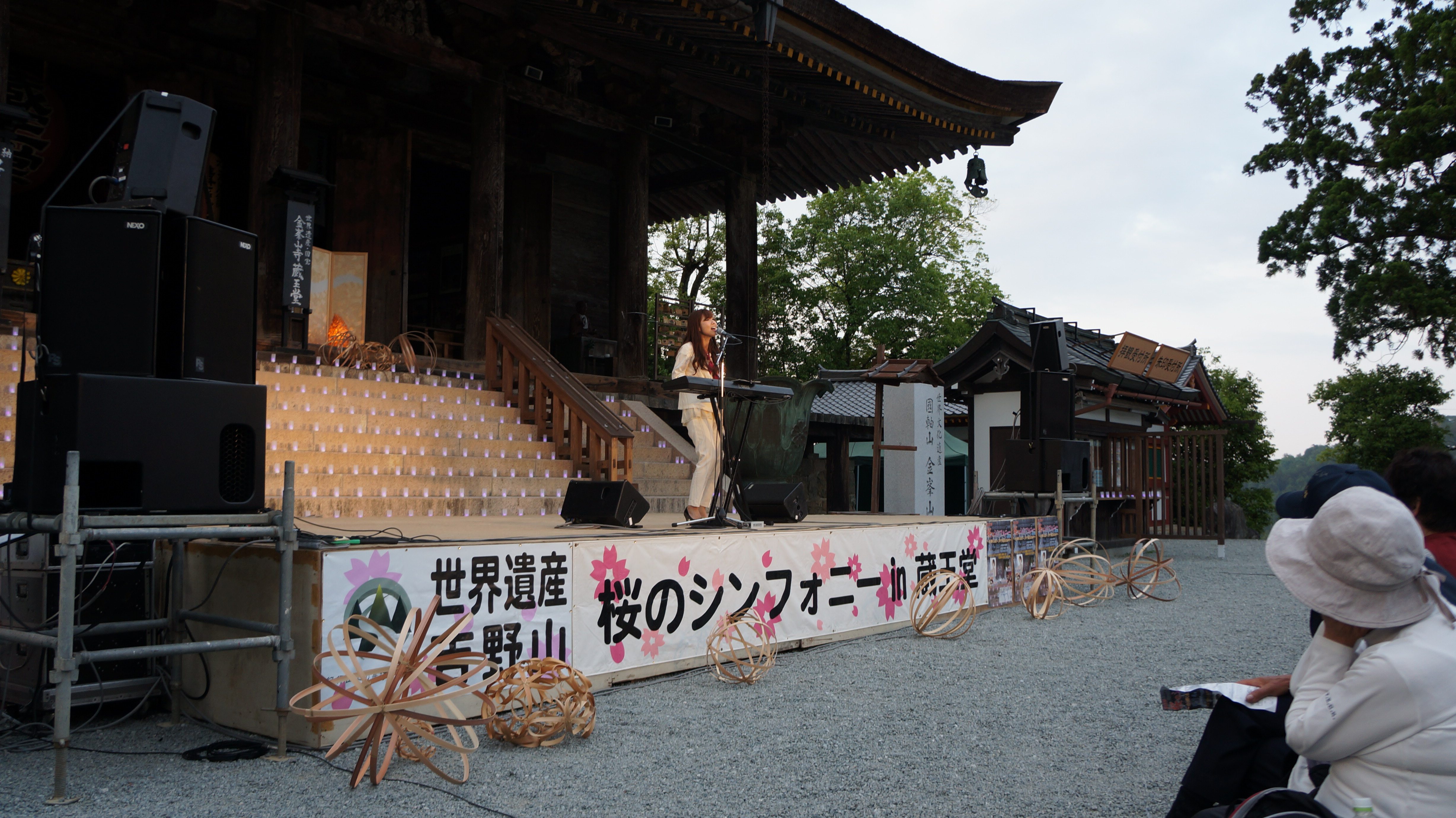 吉野青年会議所が中心となり行われる「桜のシンフォニーin蔵王堂」が、5月14日、修験道の根本道場である金峯山寺蔵王堂で行われ、吉野山のシンボル千本桜をイメージしたライトアップの舞台に4組の女性アーティストが登場しました。