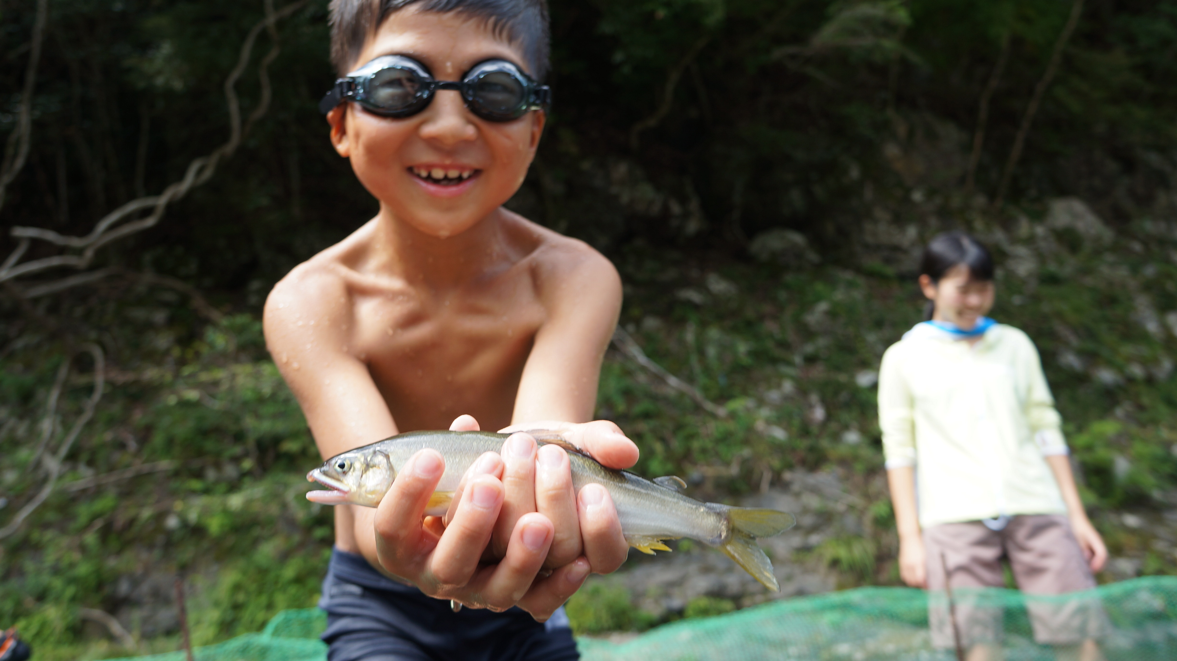 清流で鮎つかみを体験。
