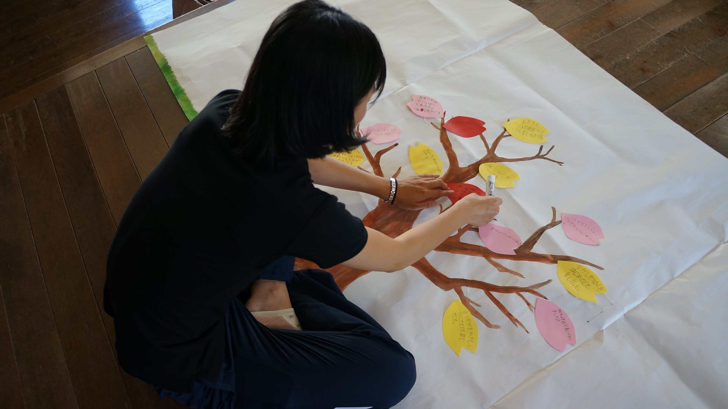 合宿の最後には、桜の花びらのメッセージカードにキャンプの思い出を綴りました。