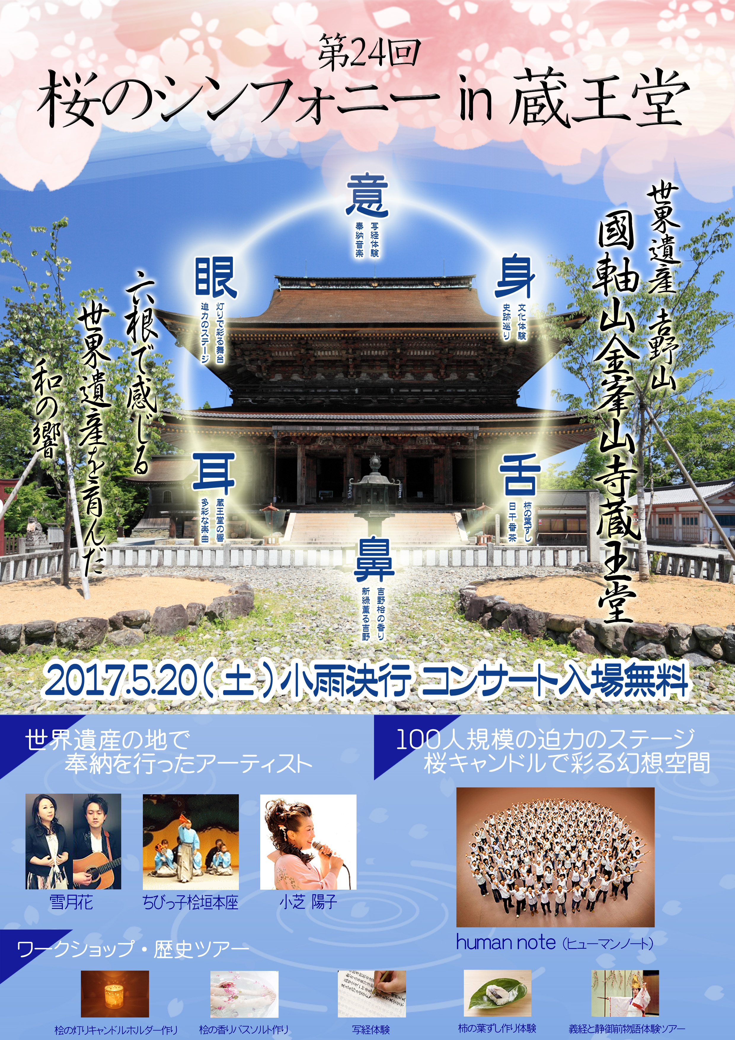 さて、そんな2017年度「よしの乃里創造委員会」が「金峯山寺青年僧の会」「吉野山観光協会」「吉野町」と共にお送りします、「第24回 桜のシンフォニーin蔵王堂~六根で感じる世界遺産を育んだ和の響~を5月20日(土曜)に開催します!ぜひ、お越しください!!
